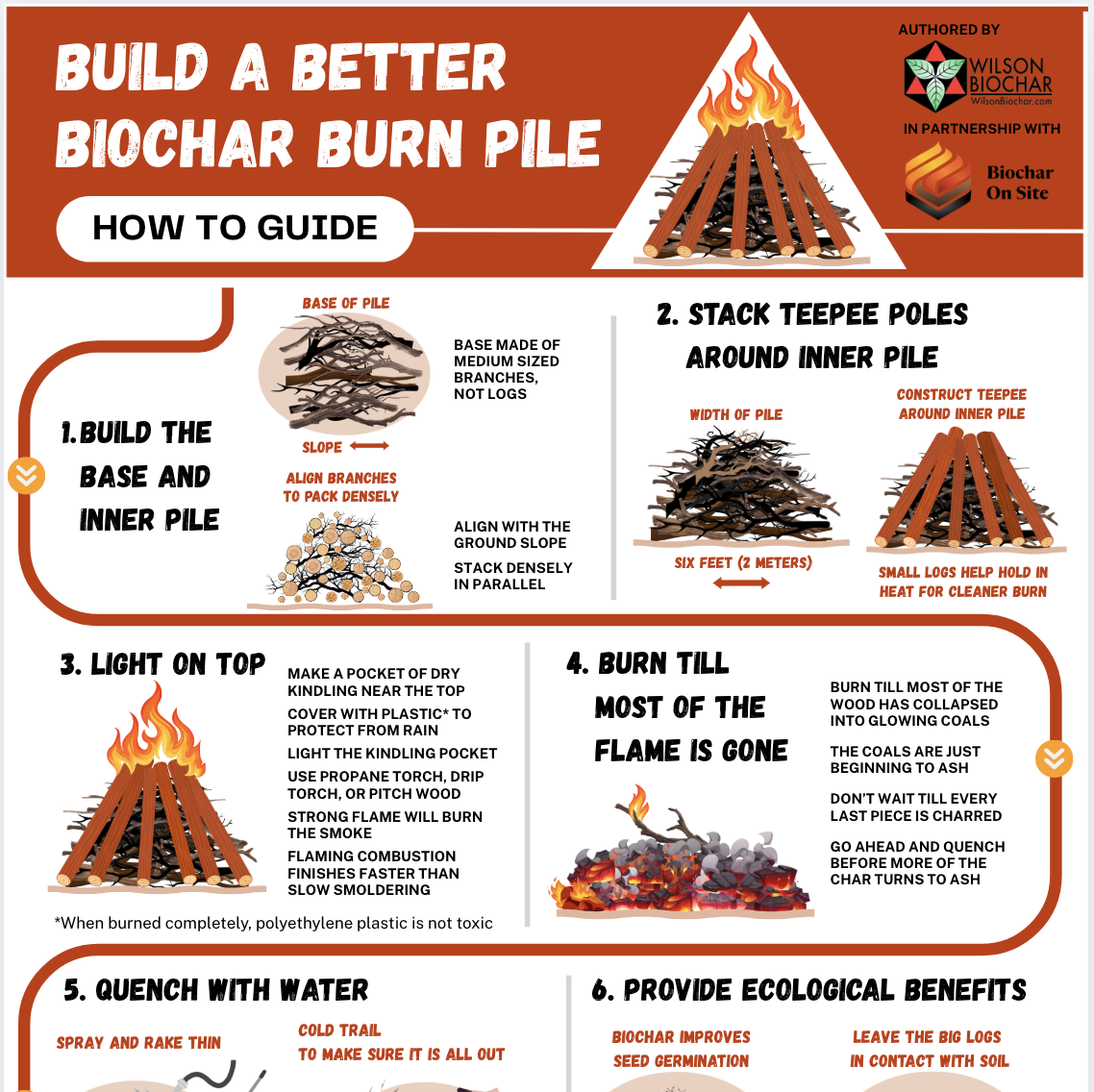Ths simple and affordable process utilizes fire to convert local slash to biochar for use on-site. Content contributed by Wilson Biochar Associates in partnership with Biochar On Site. Learn more about this process in The Biochar Handbook and the USFS RMRS_gtr439.pdf “Mobile Biochar Production by Flame Carbonization”